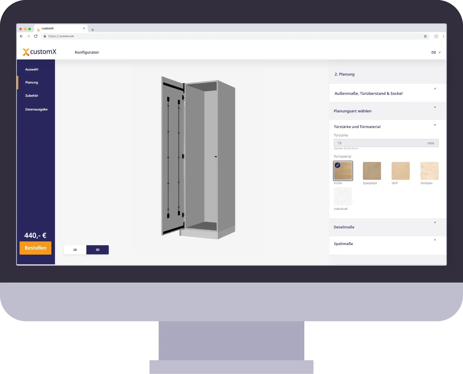 Durch den schnellen und exakten Preview in 2D und 3D mit hochwertigen Texturen wird Ihr Konfigurator zum Showroom für Ihre Produkte.